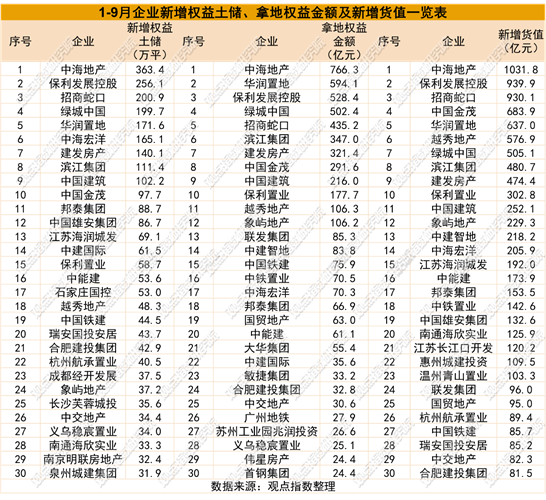从权益拿地金额来看,1-9月土地投资力度最大的企业为中海地产、华润置地、保利发展控股、绿城中国、招商蛇口,权益拓储金额分别为766.3亿元、594.1亿元、528.4亿元、502.4亿元、435.2亿元。
