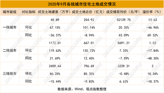 报告期内,一二三线城市成交住宅用地554宗,成交土地规划建筑面积3680.34万平方米,环比上升95.41%,同比下降6.79%;成交总价1718.63亿元,环比上升104.71%,同比下降17.30%;成交楼面均价4669.75元每平方米,环比上升4.76%,同比下降3.94%;平均溢价率3.38%。