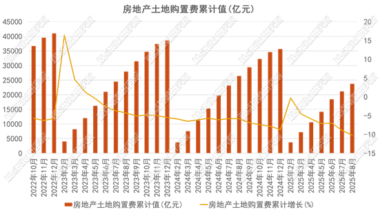 2025年1-8月份,土地购置费总量在增长,但增速放缓,8月土地购置费累计值为23751.87亿元,环比上升12.35%,同比下降10.2%,跌幅呈扩大态势。