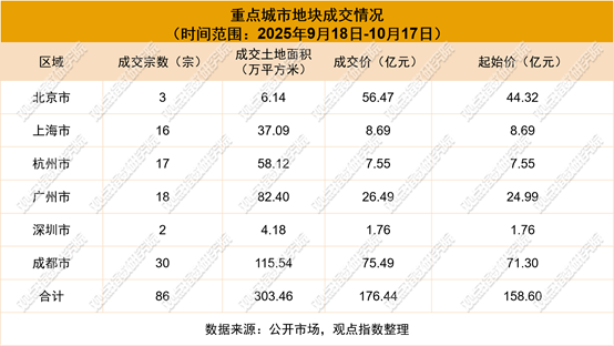据观点指数不完全统计,2025年9月18日-2025年10月17日期间,6个重点城市一共有170宗地块处于挂牌进行中,起始价319.01亿元,面积435.44平万方米。本次统计期出让面积环比上升24.48%。